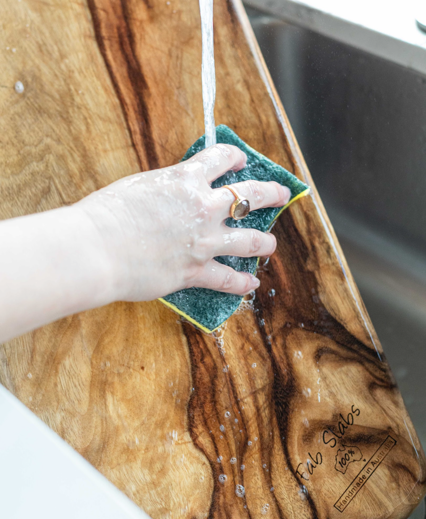 To care for your Fab Slab cutting board, simply wash it with hot soapy water after each use, then dry it and store it away. When it appears dry, lightly oil it with an edible oil such as grapeseed oil. However, there are things to avoid: don't put it in the dishwasher, leave it in the sun, or soak it in water. Additionally, there is no need to rub salt or lemon into the board. Fab Slabs boards are naturally antibacterial and do not require salt or lemon to kill germs.